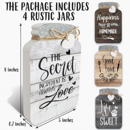 Old Shack Kitchen Wall Decor - Set of 4 Mason Jars - Charming Farmhouse Kitchen Decor - Giftable Rustic Home Decor - Lovely Dining Room Decor - Tin Top Design - 8 Inches Tall by 5 Inches Wide
